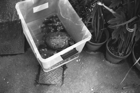 誰もいない道路沿いに置かれていたケースの中に、亀が。無防備すぎです。触れるどころか「連れて行っていいですよ」状態。いらないのか?飼い主は。