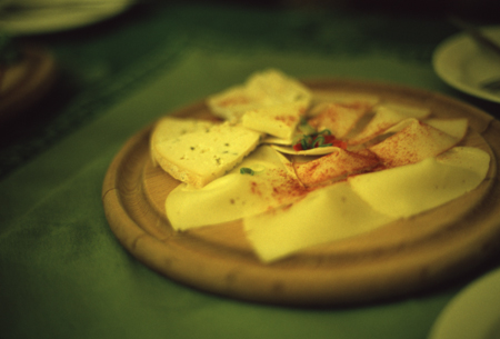 左側の青かびのチーズは目から鱗が落ちる思いの美味さ。メインのチーズは何かわからないけれど、とても薄くスライスされてピリッと辛いスパイス(多分トウガラシ)がたっぷりかけてあった。スパイスのパンチとチーズ自体のまろやかさが絶妙。