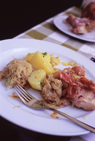 ドイツの名物「「アイスバイン」(豚の足の辺りを長時間煮込んだもの)と「ザワークラフト」(キャベツの酢漬け)、「じゃがいも」。