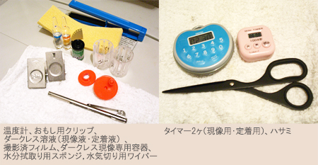 手順1:ダークレス現像に必要な道具類を用意。ベロ出し現像法をするならば、フィルムピッカーが必要。※専用温度計は所有していますが今回使っていません