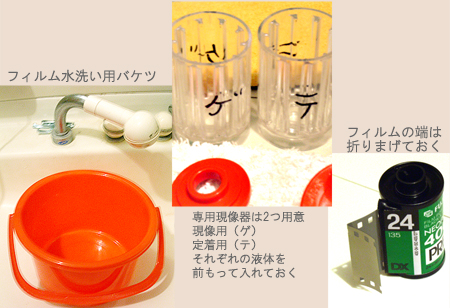 手順2:下準備も忘れずに。容器は2個用意して、素早い入れ替えを実現。フィルムを回すのが楽になる「ベロ出し法」なる現像方法をするなら、フィルムの先を出して折っておく。フィルムは必ず巻き緩めておくのもポイント。