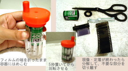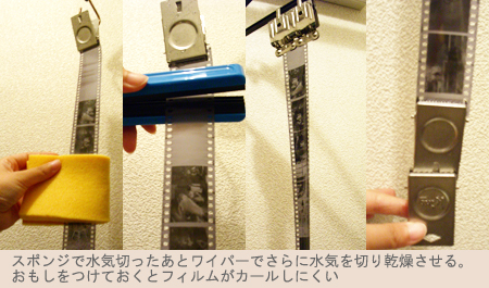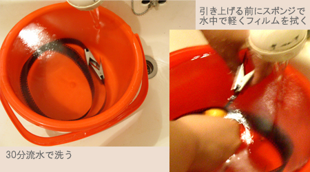 手順4:洗う、フィルムを水からあげるときにスポンジを使い水中でやさしく拭く。右の写真の説明文では「で」が続いていて変だが気にしない。