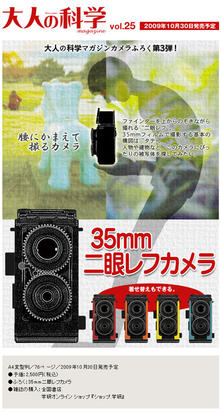大人の科学が欲しい others Twitter Facebook はてブ Pocket LINE コピー 2023.06.122009.10.18 vol.25は35mm二眼レフ。 どんなものか実際見てないからわからないし、真四角で撮れるのかどうかは謎ですが、2,500円ということで気軽に二眼ワールドに入るにはかなりなお値打ち価格かと思われます。興味ある方は予約GETしてみては? 仕組みとか、かみ砕いて説明してくれるこのシリーズ大好きです。